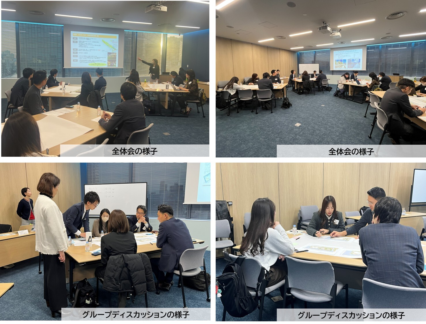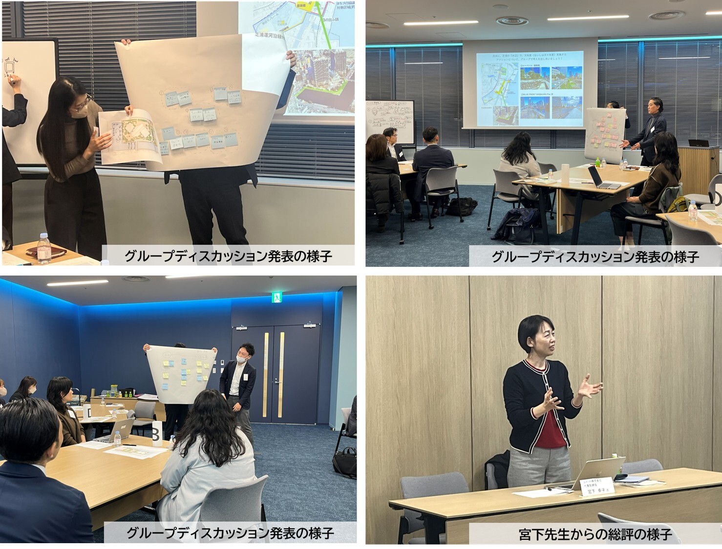 後半では、水辺エリアでのアクションについて「シーバンス・重箱堀」と「BLUE FRONT SHIBAURA」の2つの水辺空間を対象とし、グループディスカッションを行いました。A~Dの4つのグループで分かれ、模造紙を囲んで活発な意見交換が行われました。各グループからは具体的なアイデアが次々と飛び出し、最後には各グループより発表を行い、全体で共有しました。